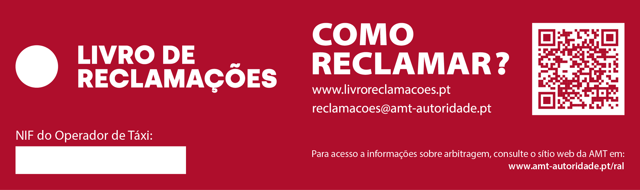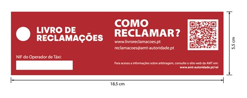 Nesse sentido, divulga-se o modelo de dístico a adotar pelos operadores de táxi, que se encontra infra, baseado no logotipo do Livro de Reclamações, e do qual constam a ligação para a plataforma do Livro de Reclamações Eletrónico, o endereço de correio eletrónico de reclamações da AMT, assim como uma ligação para informação sobre os centros de resolução alternativa de litígios.
